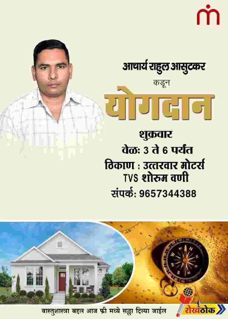 रोखठोकः दिल्ली येथील महावास्तु संस्थेतून वास्तु शास्ञात आचार्य पदवी प्राप्त करणारे आचार्य राहुल आसुटकर हे प्रत्येक शुक्रवारी वास्तुदोष निवारण आणि विस्तृत मार्गदर्शन निःशुल्क करणार आहेत. यावेळी सोबत घराचा नकाशा आणावा लागेल असे स्पष्ट करत या संधीचा लाभ घ्यावा असे आवाहन करण्यात आले आहे.